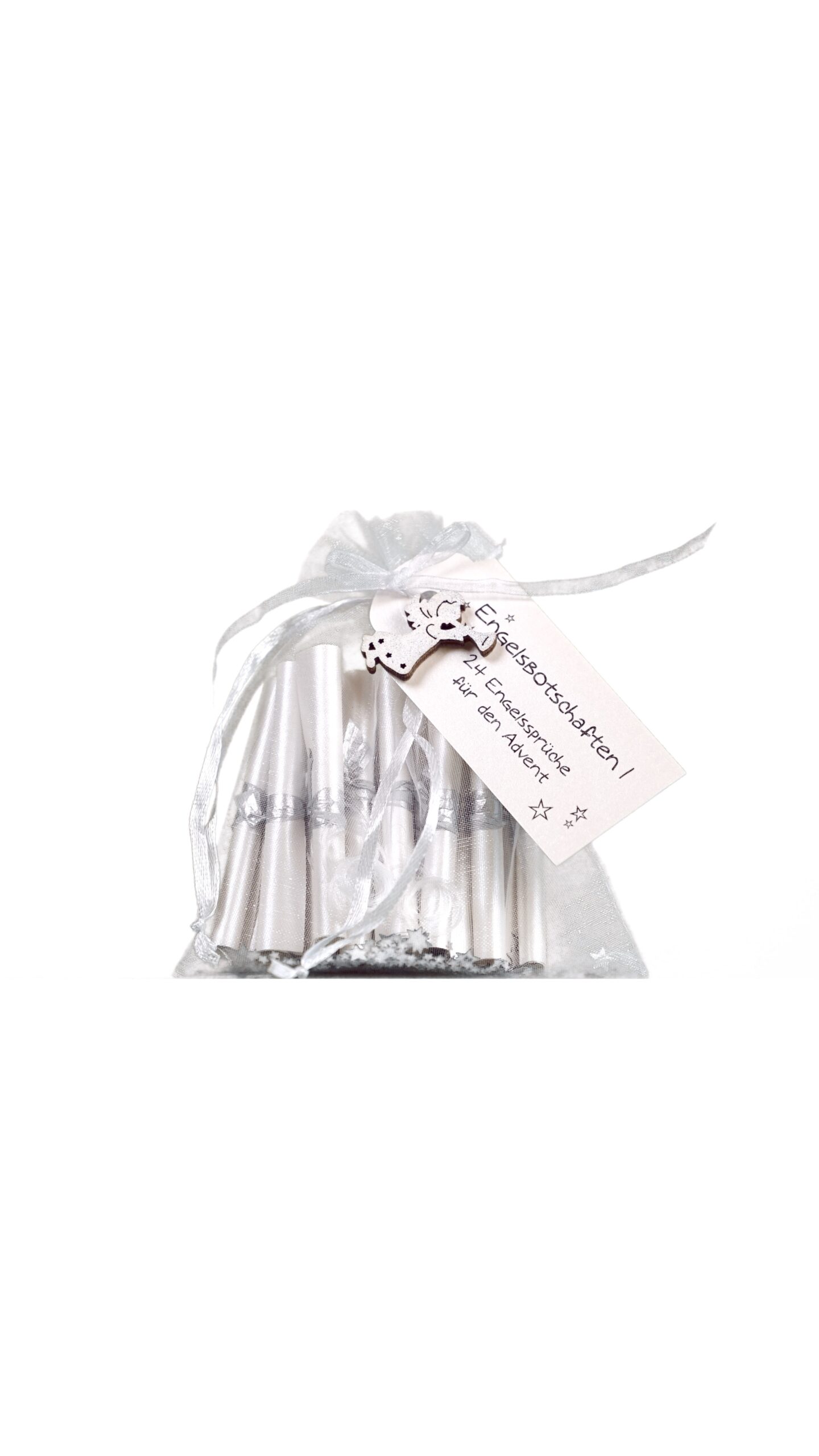 Ein zauberhafter Begleiter durch die Adventszeit: 24 liebevoll gerollte Engelsbotschaften im Organzasäckchen warten darauf, dich Tag für Tag mit Wärme und Besinnlichkeit zu überraschen. Handgefertigt und einzigartig – ein kleines Ritual für jeden Dezembermorgen.